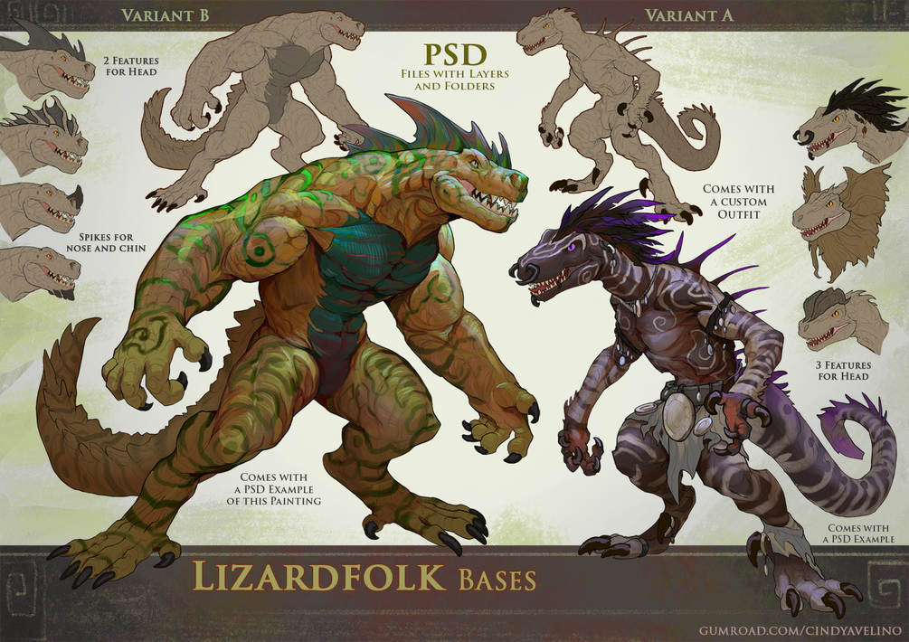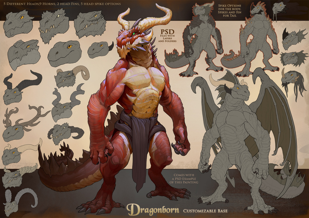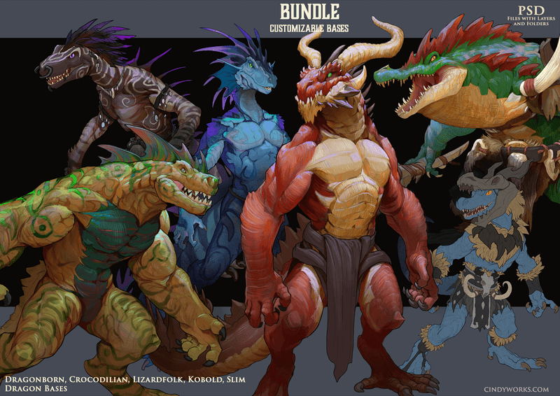This Bundle Contains the Bases: Dragonborn, Crocodilian, Lizardfolk (variant A+B), Kobold( barbarian, mage and explorer) and Slim Dragon (female and male variants).