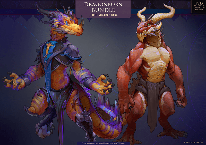 PSD Files with customizable parts in Layers for you to paint and create your own Dragonborn or Dragon character!